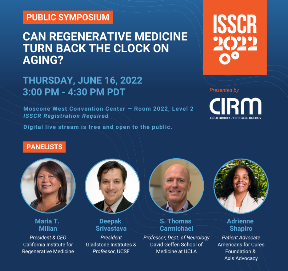 On June 16th from 3p – 4.30p PST we are holding a panel discussion exploring the impact of regenerative medicine on aging. We’ll hear from experts on heart disease and stroke; we will look at other ground breaking research into aging; and we’ll discuss the vital role patients and patient advocates play in helping advance this work.