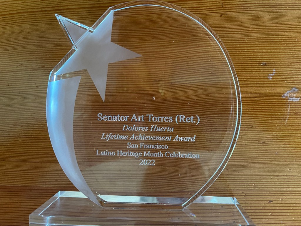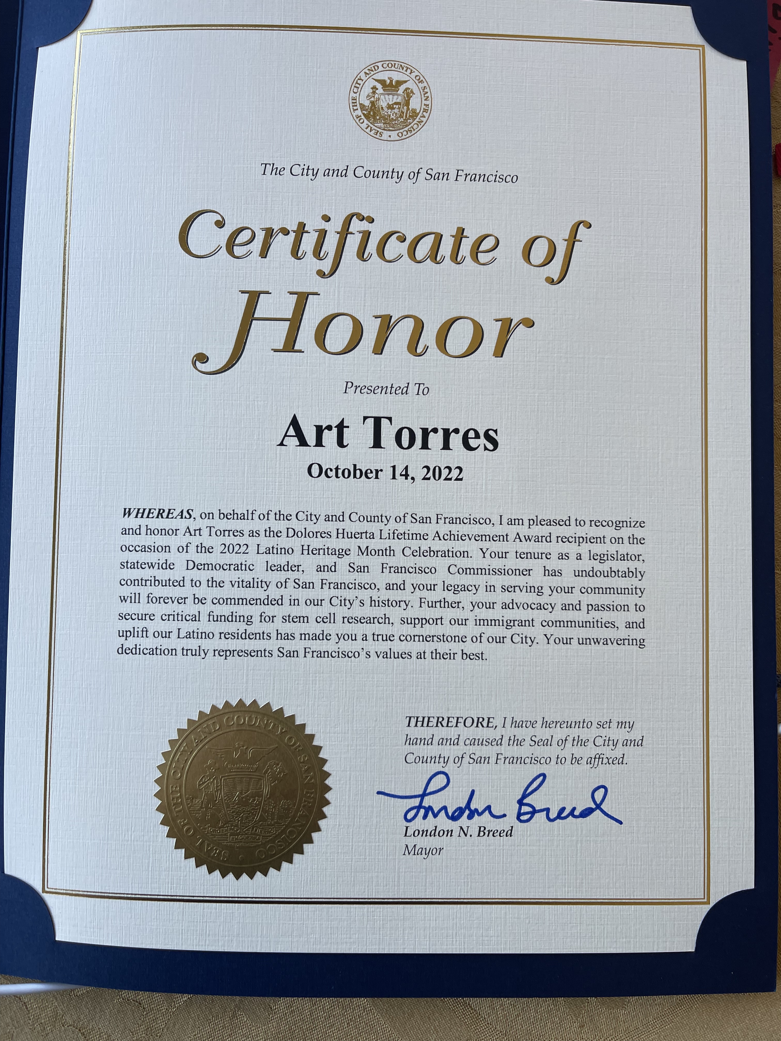 The award ceremony was something of a family affair as the MC for the event was Joaquin Torres, Art’s son and the current Assessor-Recorder for San Francisco. Dolores Huerta sent a video greeting, and San Francisco Mayor London Breed presented him with a Certificate of Honor, praising Art for: “your advocacy and passion to secure critical funding for stem cell research, support our immigrant communities, and uplift our Latino residents has made you a true cornerstone of our city.”