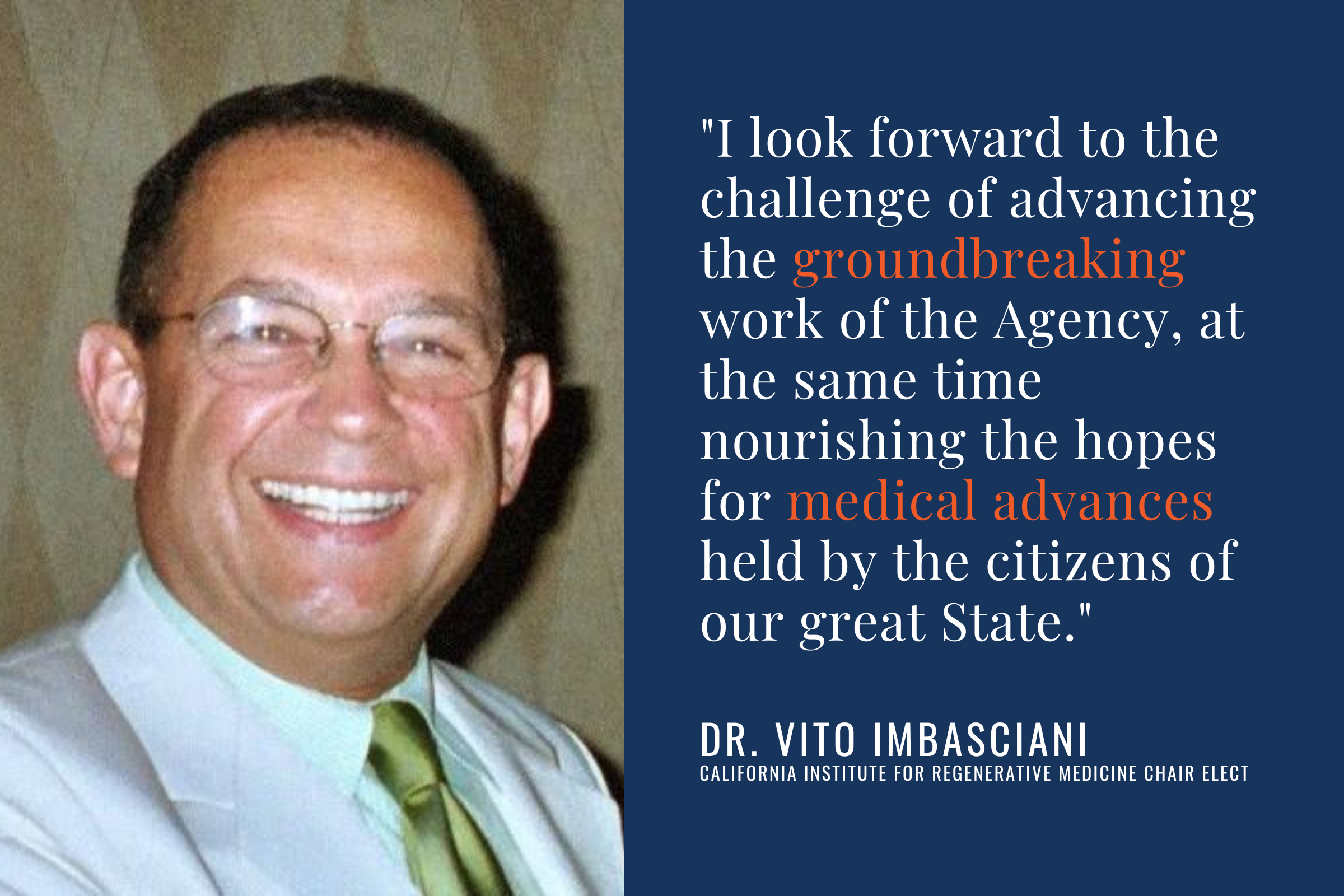 Dr. Vito Imbasciani will be the new Chair of the California Institute for Regenerative Medicine (CIRM), the state agency created by voters in 2004 and funded again in 2020 to invest in stem cell and regenerative medicine research and treatments.