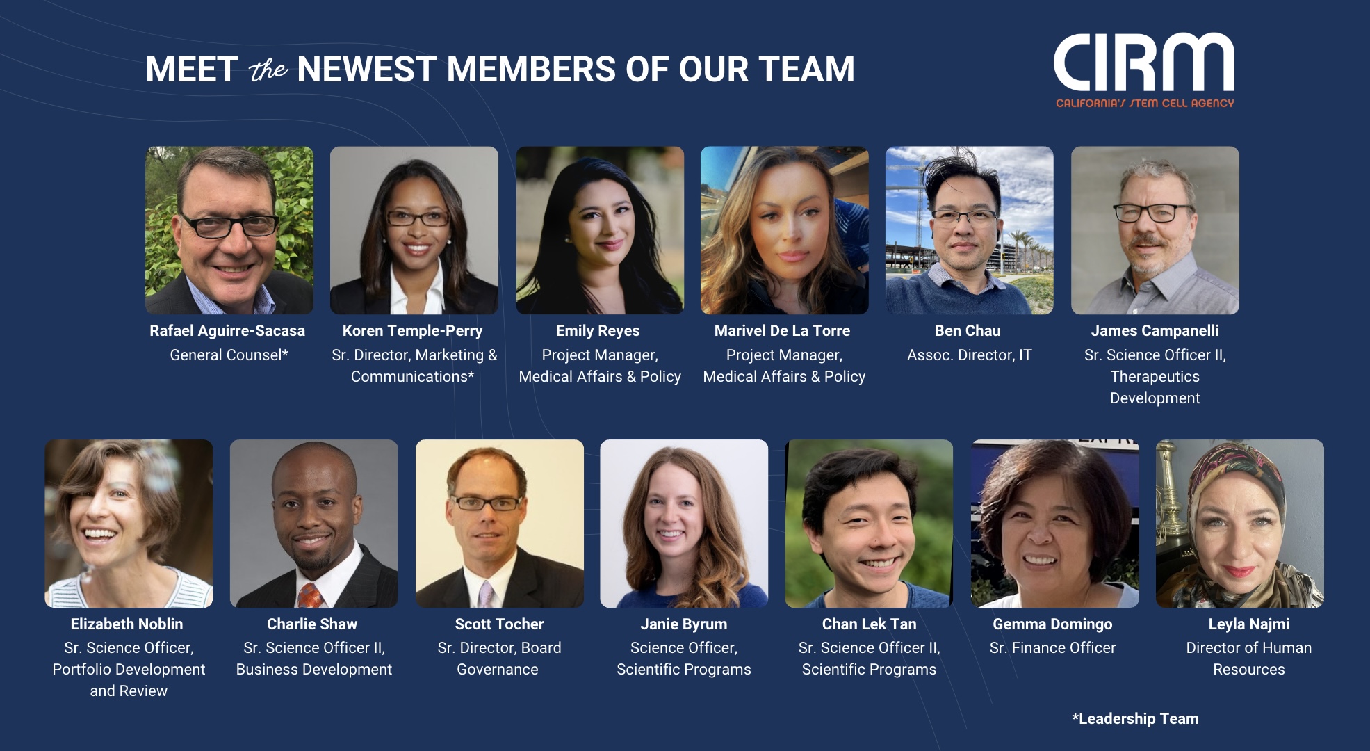 “We are delighted to have these talented individuals join the CIRM team,” says CIRM President and CEO Dr. Maria Millan. “They all bring unique qualifications and critical skills to support our strategic plan and advancement of CIRM’s mission to accelerate world class science for California and the world. We look forward to working with all of them.”