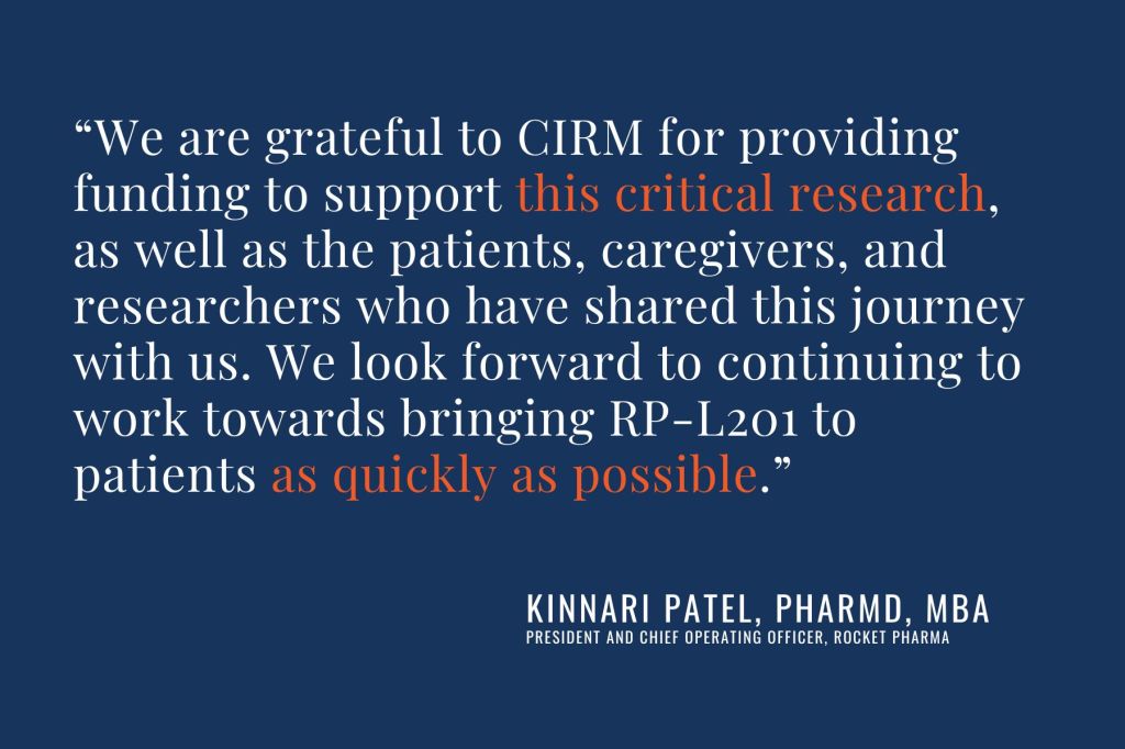 “Currently, the only treatment option is a bone marrow transplant, which has substantial morbidity and mortality, and may not be accessible in time for these children,” said Kinnari Patel, PharmD, MBA, President and Chief Operating Officer, Rocket Pharma. “We are grateful to CIRM for providing funding to support this critical research, as well as the patients, caregivers and researchers who have shared this journey with us. We look forward to continuing to work towards bringing RP-L201 to patients as quickly as possible.”